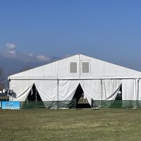 Λυόμενη αίθουσα γερμανικής κατασκευής, διαστάσεων 16μ x 25μ, με σκελετό αλουμινίου και επικάλυψη από άκαυστο, αδιαπέραστο στο φως PVC (sunblock).